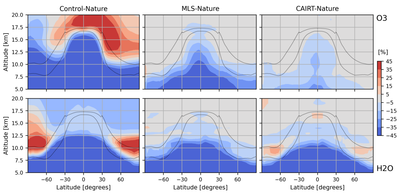 Results from the Observing System Simulation Experiment (OSSE) demonstrate that CAIRT would be able to constrain ozone (top row) and water vapour (bottom row) in the critical upper troposphere and lower stratosphere as good or even better than the Microwave Limb Sounder (MLS). MLS is considered the gold standard for these observations but soon to expire. The dashed lines represent the thickness of the tropopause during the specified time frame from October 2021 to Febuary 2022 (credits: BIRA-IASB – Q. Errera)."