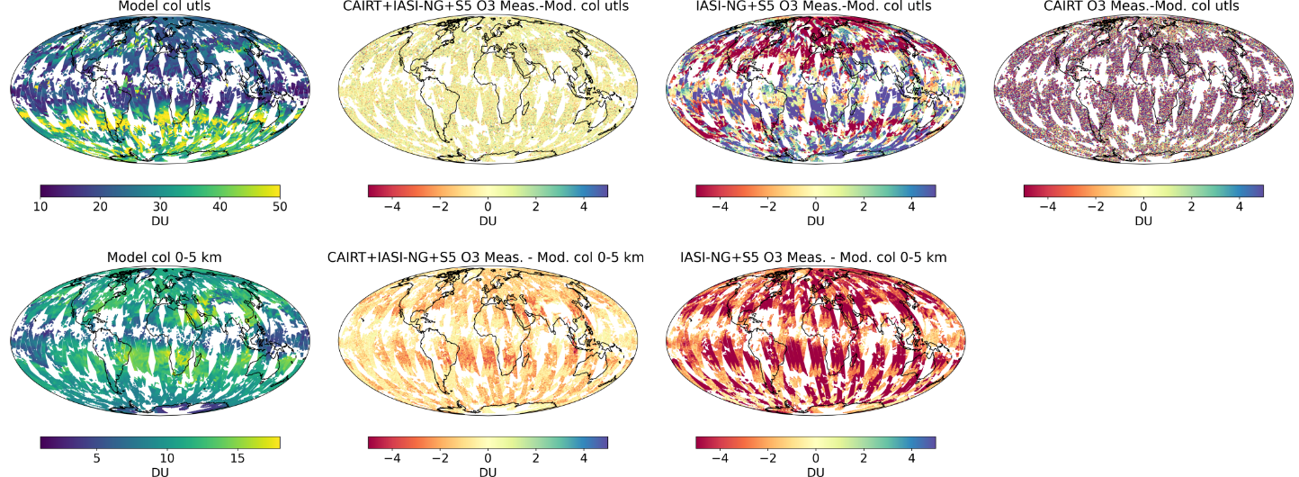 The top row shows the absolute error for a retrieved UTLS ozone partial column (from tropopause – 3 km to tropopause + 3 km), with evident improvements over individual CAIRT and IASI-NG+S5 data products. These improvements will benefit UTLS studies and will enable better characterisation of stratosphere-troposphere exchange. In addition, the synergistic retrievals of nadir and limb products significantly improve the partial column of lower tropospheric ozone compared to IASI-NG+S5 alone (bottom row), highlighting the contribution that limb sounding can bring when combined with the nadir sounding for observations in the troposphere.